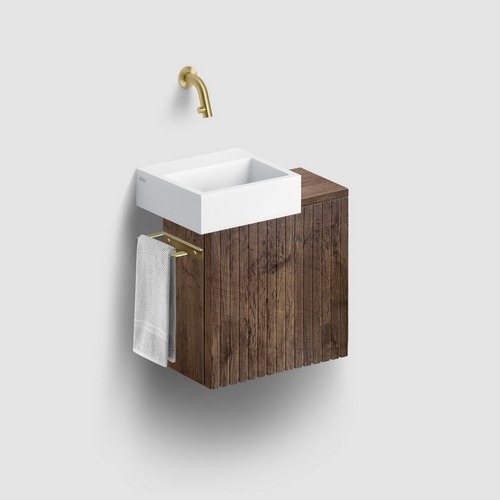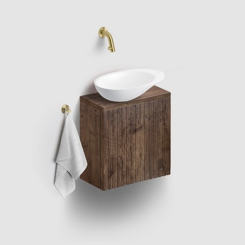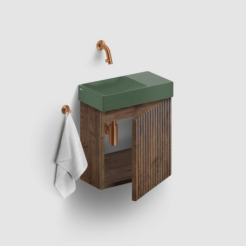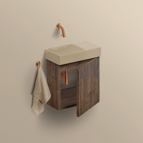 Het kastje in donker eiken met ribbelfront is helemaal mee met de huidige trend. Flush 3 en Vale 38 zijn beschikbaar in mosterd, italiaans zand, blauw, roze en pijnboom groen. Het o zo schattige ronde Vale 22 fonteintje, eveneens beschikbaar in deze kleuren, combineer je dankzij de kleurrijke bovenbladen.Ook de organische First & robuuste Flush 1 fonteinen van het Nederlandse designmerk passen op het kastje. Voeg een haakje of handdoekrail toe en je hebt een echte eye-catcher in huis die ook nog eens superpraktisch is. Dankzij de geringe afmetingen (slechts 36 cm breed en 18 cm diep!) past dit kastje probleemloos in de compactere toiletruimte. Zo berg je al je extra toiletspullen makkelijk en binnen handbereik op. Met soft-closing, beschikbaar in linkse en rechtse versie.